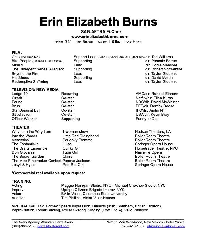 Erin Elizabeth Burns is your every day actin' lovin' dog mom who is trying to find her way in life.. just like you. With more time to think in 2020 then ever before, she came to the realization that unless she updates her passport, she's stuck here and better well find a way to understand her neighbors and what makes them who they are.Erin studied at the Maggie Flanigan Meisner Studio in NYC, the Upright Citizens Brigade Improv, & the Michael Chekov Studio. She teaches acting online and hikes as many National Parks as she can.If you wanna catch Erin on screen, you'll find her opposite John Cusack & Samuel L. Jackson in Stephen King’s Cell, Funny or Die’s Officer Wanker: Worst Responder, IFC’s Stan Against Evil, along with Netflix's Ozark, AMC's Lodge 49, the coal mine disaster film, Mine 9, & NBC's Found